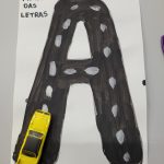 Pista de letras confeccionada com a letra inicial do nome da criança. As crianças pintaram a pista com guache preto, fizeram o tracejado imitando uma pista e com carrinho brincaram sobre a letra.