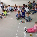 Nessa aula, fiz uma pista no chão da sala com fita adesiva, para que as crianças brincassem com os carrinhos confeccionados na aula anterior e disponibilizei peças de encaixe para que construíssem uma cidade ao redor da pista. Durante a brincadeira, utilizei algumas placas de trânsito, como o semáforo, e fui realizando algumas interferências, como: dizer que o semáforo está vermelho – as crianças tinham que ficar paradas; o sinal ficou verde – elas poderiam continuar percorrendo a pista.