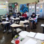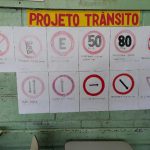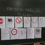 Os alunos com a ajuda da professora confeccionaram algumas placas de trânsito: limite de velocidade, proibido estacionar,  pare, etc. Algumas placas os alunos que não dirigem não conheciam, como: de a preferência e passagem obrigatória. Com as placas prontas, a professora comentou o significado de cada uma delas e fizeram um painel na sala de aula.