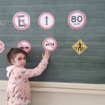 Foram apresentadas algumas placas de trânsito para as crianças para que elas dissessem qual o significado de cada uma delas, as que as crianças não sabiam, eram apresentadas pela professora.