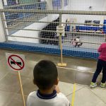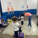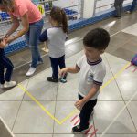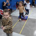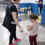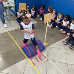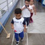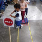 As crianças praticaram os ensinamentos em um circuito de trânsito, com lombadas e trajeto, trabalhando o equilíbrio ao caminhar segurando com o carrinho na colher.