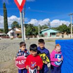 Realizamos com os alunos uma caminhada como de costume, só que estavam levando em suas mãos algumas placas de trânsito as quais eles tinham que perceber se alguma placa tinha próximo a escola. Durante a caminhada conversamos sobre a importância das placas de trânsito.