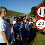 Turma do 2º ano visitando o viaduto próximo à escola, identificando placas de sinalização.