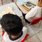 Os alunos sentaram em duplas e procuraram em revistas, imagens que ilustrassem a música.