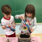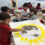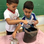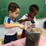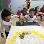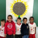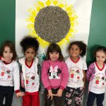 Os alunos ouviram a história “Gigi, o girassol”; as professoras fizeram uma roda de conversa onde falaram sobre a importância  da água, da luz, da terra para as plantas; conversaram também sobre o plantio que iriam realizar, a utilização das sementes. Todos os alunos fizeram o plantio das sementes, que ao longo dos dias serão cuidadas por cada um. Para finalizar a atividade fizeram a confecção de um cartaz coletivo com o carimbo das mãozinhas utilizando tinta guache e colagem das sementes de girassol. Foi uma atividade muito dinâmica, onde todos amaram!