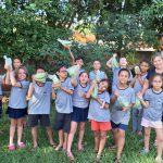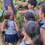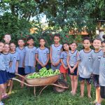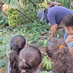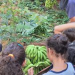 A professora levou os alunos para fazer a colheita das bananas cultivadas no pomar da nossa escola.
