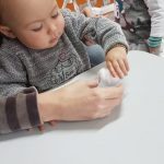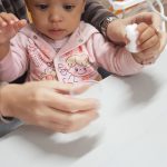 Explicamos que iriamos plantar o feijãozinho, pegamos o algodão e deixamos eles sentirem a textura. Em seguida pegamos os copinhos, molhamos o algodão, as crianças colocaram o algodão no copinho e o feijãozinho.