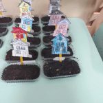 Cada criança colocou uma semente de girassol na terra, enterrando-a levemente com a ajuda dos dedos.