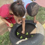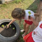 Realizamos uma atividade com as crianças, em que plantamos mudas de alface em pneus reciclados, com o objetivo de despertar o interesse pela preservação ambiental e ensinar sobre o cuidado com a natureza. Primeiro, conversamos sobre a importância das plantas e como elas ajudam a manter o ar limpo, além de servirem como fonte de alimento saudável. Explicamos que, ao reutilizar um pneu para fazer a horta, estávamos evitando que ele fosse descartado no meio ambiente, onde poderia poluir o solo e prejudicar a vida dos animais e plantas. As crianças ficaram entusiasmadas ao saber que estavam contribuindo para o meio ambiente de uma forma divertida.