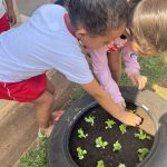 Durante o plantio, cada criança teve a oportunidade de segurar as mudinhas de alface e ajudar a colocá-las na terra dentro do pneu. Mostramos como preparar a terra, plantar e, principalmente, como cuidar da muda, regando e observando seu crescimento. Essa experiência prática proporcionou às crianças um momento de conexão com a natureza, em que puderam ver de perto a importância de cuidar do meio ambiente. As crianças ficaram muito empolgadas observando o desenvolvimento das alfaces e logo faremos a colheita e prepararemos um delicioso sanduíche!