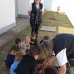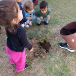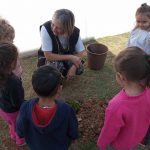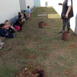As crianças e a professora, com auxilio da funcionária Salete irá auxiliar no plantio das mudas de caqui e ameixa.