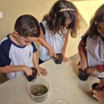 Os alunos dos 1º anos aprenderam que o plantio de mudas é uma estratégia utilizada para conter os impactos ambientais decorrentes de atividades que resultam em degradação ou supressão de áreas naturais, como construção de infraestrutura. Essa prática busca equilibrar as perdas ambientais causadas por tais ações, promovendo a recuperação e restauração de ecossistemas por meio do plantio de mudas de espécies vegetais nativas. Como culminância dessa aula, os alunos plantaram sementes de plantas diversas para levarem para suas casas e escolherem juntamente com um familiar, o local para plantio e cuidado.