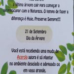 Está ação foi realizada pela Unidade escolar inteira, com a ajuda e colaboração do departamento de meio Ambiente que nos forneceu mudas de árvores frutíferas. foi trabalhado o dia da árvore sua importância e preservação….a partir daí resolvemos dar para as famílias mudas frutíferas para que as crianças, já que nossas crianças na escola recebem uma alimentação saudável e equilibrada, onde são oferecidas frutas todos os dias. Uma ação para a conscientização de todos.