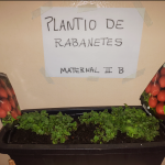 Desenvolvimento: A professora apresentou a história “O grande rabanete” numa roda de conversa, depois foi realizado um debate sobre a história. A professora levantou vários questionamentos aos alunos: Quem conhece o rabanete? Alguém já viu alguma plantação de rabanetes? Alguém já comeu rabanete como os personagens da história? O rabanete é saudável? Diante da conversa, a professora apresentou algumas propriedades do rabanete e seus benefícios para a nossa saúde. Depois de todo o processo de familiarização teórica sobre o rabanete, a professora apresentou a jardineira onde seriam plantadas as sementes do rabanete da turma. As crianças ficaram muito interessadas e ansiosas para o plantio. Após todo o processo de cultivo, foi feito um acompanhamento diário da jardineira, onde os alunos puderam regar e acompanhar o crescimento dos rabanetes. Por fim, após o tempo de cultivo e crescimento dos rabanetes, foi possível realizar a colheita juntamente com as crianças e preparar uma deliciosa salada de rabanetes. Usamos sal, limão e azeite para temperar a salada de rabanetes. Todos puderam experimentar e se deliciar.