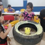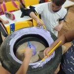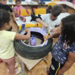 Pneus velhos sendo usados para trabalhar cores.