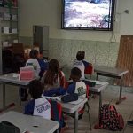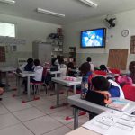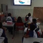 Posteriormente, foram exibidos vídeos explicativos sobre o ciclo da água, abordando de maneira didática os processos de evaporação, condensação e precipitação. Após a exibição, houve um momento de discussão coletiva, no qual os alunos puderam compartilhar suas compreensões, tirar dúvidas e relacionar o conteúdo com situações do dia a dia.