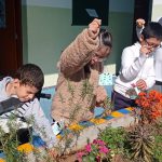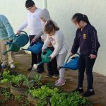 Atividade fora da sala cuidando da horta da escola.