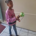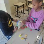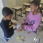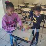 - Produção do “vai e vem”: utilizando duas metades de garrafa pet e uma corda, os alunos juntaram essas garrafas com fita transparente e passaram uma corda de modo que ficasse saindo pelas extremidades das garrafas. Depois, fizeram quatro nós na corda para que ficassem como alças e facilitasse na hora de brincar. Depois disso, enfeitaram as garrafas com fitas coloridas.