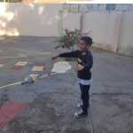 - Produção do bilboquê: utilizando uma garrafa pet cortada ao meio, três tampinhas e o barbante, os alunos iniciaram a produção do bilboquê. Eles enfeitaram a metade da garrafa com fita colorida e passaram um pequeno pedaço de barbante no furo da tampa e deram um nó. Em seguida, prenderam com fita adesiva duas tampinhas na outra extremidade do barbante. Assim, o brinquedo ficou pronto e eles brincaram de tentar acertar a tampinha dentro da garrafa.
