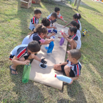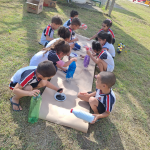 Foram solicitados às famílias recipientes que seriam descartados em suas residências, como garrafas de refrigerante, potes de manteiga ou margarina, latas de leite em pó ou achocolatado, entre outros. Com a coleta feita com sucesso, as crianças tiveram o desafio de pintar os recipientes do seu jeito para que esses recipientes pudessem ser reaproveitados em atividade futura.