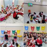 Em outro momento, fizemos a Brincadeira do lixo certo, onde cada criança recebeu um objeto reciclável e precisou colocar na lixeira correta. A professora ajudou, reforçando as cores das lixeiras.
