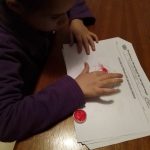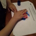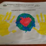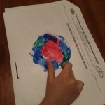 Para finalizar a sequência de atividades sobre o meio ambiente, conscientizando e desenvolvendo a coordenação motora, os alunos com dificuldades motoras deveriam pintar e colocar as mãos sujas de tinta ao redor do planeta simbolizando os cuidados. A atividade além de conscientizar sobre os cuidados com o meio ambiente com esta aluna em especifico trabalha a coordenação motora fina e a noção de espaço. Trata-se de uma atividade desenvolvida com aluna Especial com Apraxia Motora.
