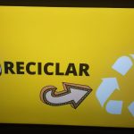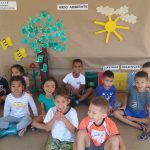 -Cartaz com materiais recicláveis (tronco com rolinhos de papel higiênico) pintura com guache e representação dos coletores.