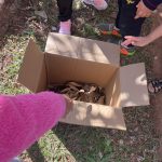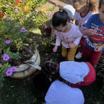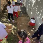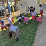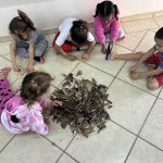 As crianças foram levadas para um passeio pelo pátio da escola, onde puderam coletar elementos naturais como folhas, gravetos, pedras pequenas, flores secas, sementes, pinhas e cascas de árvores. Antes da coleta, a professora reforçou a importância de não danificar plantas vivas, incentivando as crianças a recolher apenas materiais que já estão no chão.