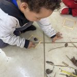A professora explicou que cada criança vai criar seu próprio quadro utilizando os elementos naturais que coletaram. Eles puderam organizar os materiais da maneira que desejaram, formando paisagens, padrões abstratos ou até figuras reconhecíveis, como animais ou plantas. As crianças começaram organizando os materiais naturais coletados. Primeiro planejaram a disposição dos elementos antes de colá-los. Essa etapa permite que explorem a criatividade e pensem em como combinar diferentes formas, texturas e cores dos materiais.
