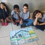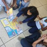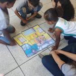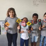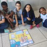 Após a história, a professora dividiu a turma em grupo para realizarem a montagem do quebra-cabeça, com o objetivo de interpretar mensagens de sinalização de trânsito.