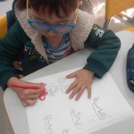 Em um segundo momento, as crianças pintaram recortes em formato de gotas de água, utilizando lápis de cor.