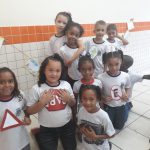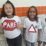 Para treinar os alunos sobre o respeito à sinalização de trânsito a tia Pollyana transformou vários alunos em placas vivas.