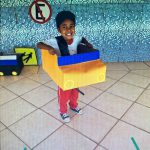 - Circuito com as crianças usando carros de papelão e cinto de segurança.