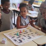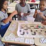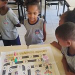 A professora iniciou a aula com uma roda de conversa falando sobre o trânsito, enfatizando as regras básicas de trânsito e as placas de sinalização.
