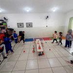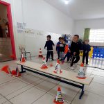 Utilizando o tema trânsito seguro, a brincadeira de tiro ao alvo tem como objetivo desenvolver o senso de direção, a habilidade motora básica – arremesso, o raciocínio lógico e a competitividade por meio de arremesso direcionado. A brincadeira ocorre da seguinte forma: os alunos devem acertar os cones de acordo com a resposta que a figura do mesmo apresenta. Por exemplo: qual é cor do semáforo de pare? Os alunos respondem à pergunta e devem arremessar as bolas na direção do cone que tem a figura do semáforo de cor vermelha, a equipe que derrubar o cone da resposta correta marca ponto e assim sucessivamente. Esse tipo de atividade é muito interessante e ajuda na fixação do conteúdo desejado de forma divertida e empolgante.