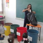 Metodologia: Realizar leitura da história e conversar com as crianças sobre a maneira correta de descartar o lixo que produzimos.Organizar os cestos de lixo nas cores verde, amarelo,azul,vermelho e marrom e orientá-los sobre como separar o lixo.
