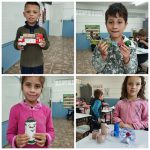 Sendo assim, foi realizado em sala, conversação, vídeos explicativos, atividades escritas e confecção de objetos e matérias utilizando lixo reciclável: papelão, caixas, garrafas Pets, tampinhas, potes e outros.
