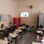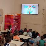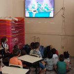 Durante o vídeo, as crianças demonstraram grande interesse e curiosidade, identificando as cores das lixeiras e comentando os exemplos mostrados pelos personagens. Após o desenho, foi realizada uma roda de conversa para reforçar o que aprenderam, destacando a importância de jogar o lixo no lugar certo e de reaproveitar materiais.