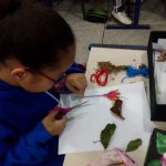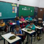 Foram muitas folhas, de diversos tamanhos, cores e formatos diferentes. Conversei que com aquelas folhas poderiam aparecer várias coisas. Que cada aluno pesquisasse e na próxima aula iniciamos o trabalho. Ficaram encantados com os resultados que ficou exposto no corredor da escola e apreciado por todos.