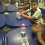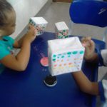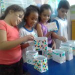 Foi desenvolvida uma atividade onde os alunos confeccionaram um suporte para o ovo de páscoa que ganhariam na escola, utilizaram caixinhas de leite que foi decorada com papel sulfite pintado à mão com guache de várias cores.