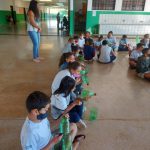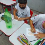 Conversamos com os alunos e explicamos que o plástico é um dos maiores vilões da natureza, e que podemos separa-los para reciclagem ou reutilizar as embalagens e dar novas funções para elas.