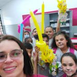 Dessa forma Confeccionamos uma cestinha de Páscoa para acomodar o ovo de chocolate, trabalhando a conscientização de não jogar produtos plásticos na natureza.