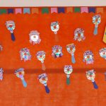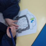 Depois, recortaram retalhos de papel que sobraram de outras atividades em pequenos pedaço e enfeitaram o chapéu da imagem.