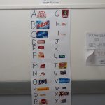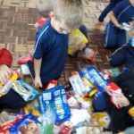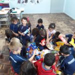 Após a conversa os alunos selecionaram as embalagens trazidas e confeccionaram o mural Reciclando embalagens.