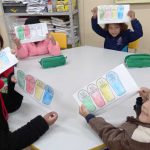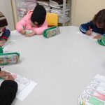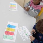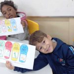 Em seguida, foi proposta uma atividade prática: colorir, recortar e colar os materiais nas lixeiras correspondentes às cores da reciclagem. A turma demonstrou interesse e envolvimento, reconhecendo as cores e associando corretamente cada tipo de material reciclável.