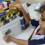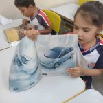 Durante a atividade, cada criança teve a oportunidade de explorar as revistas com atenção, identificando figuras que representavam os transportes já conhecidos e descobrindo outros novos. Esse momento foi rico em trocas e aprendizagens, pois os alunos compartilharam descobertas, compararam veículos e ampliaram seu vocabulário.