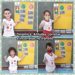 Atrás da roda de conversa, ocorreu a realização de uma dinâmica. Uma criança por vez, escolhia uma carta que possui imagem e uma frase explicativa da mesma referente às regras de trânsito. A professora da classe, lia a carta para os alunos e em conjunto decidiam se tinha que colocar a carta na coluna do joia verde (que simboliza que está certo) ou se é atitude incorreta para o trânsito deveria colocar a carta no joia vermelho virado para baixo e assim prosseguiu até todos os alunos participarem da dinâmica.