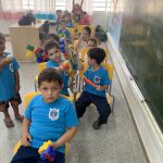 Durante uma atividade livre com materiais de largo alcance, partiu da iniciativa das crianças em posicionar as cadeiras de maneira que cada uma representasse um veículo no trânsito e cada criança seu condutor.