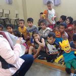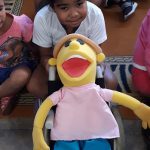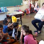 Roda para a leitura do álbum seriado Educar para Humanizar o Trânsito e representação com os fantoches.
