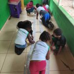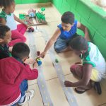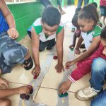 A aula começou com uma conversa sobre o que é trânsito e por que é importante seguir as regras para garantir a segurança de todos. Depois, a professora apresentou um circuito de trânsito improvisado na varanda da escola, usando fitas, placas de papel, papelão e carrinhos de brinquedo.